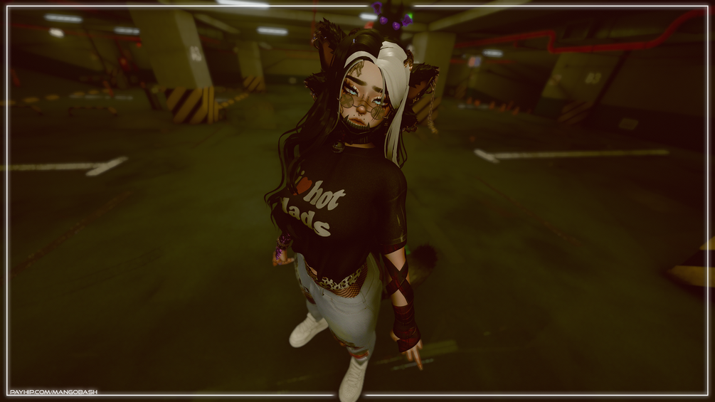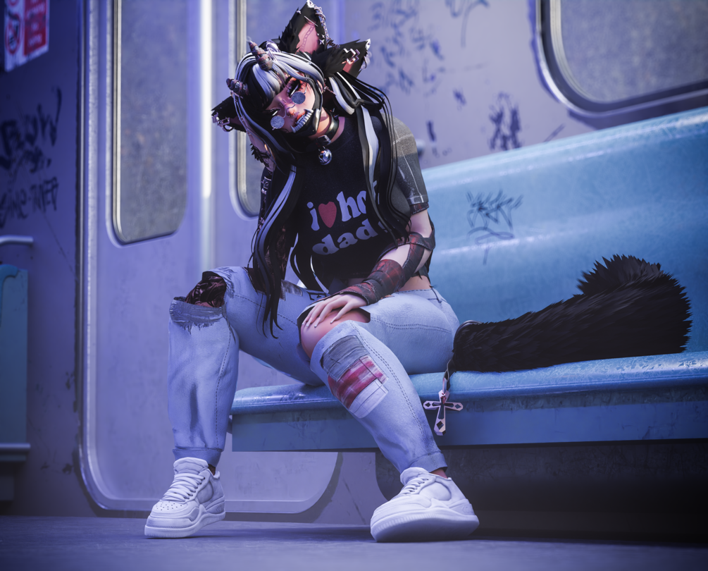 Body (RP base), fishnet texture: Sugs#9795 (body is edited, no reuse) | Head (no re-use of my edit): sivka; | Piercings (ear, face, body): swayzhee, sivka; | Body textures: ying.vr, lunii | Face texture: miing, lunii | Eye textures: Mooshi (re-uv-mapped) | Hair (some hair was re-uv mapped): Saikura, Lethal#0504 | Hair texture: Cicieaaa#7777,Mowster#9962 (server freebie) | T-Shirt: Evan | Bikini: aikavr | Fishnet bikini: EVA -#2622 | Chest harness: teddymuffins | Spiked bracelet: PastelPlushies | Arm wraps, bloody horns: Nauuki | Ears and double horns (nitro), tail (paid): FormulaRats (name tag by me) | Cyber Jaw: Kittyz#6666 | Glasses: milkymutt#6666 | Socks: ImLeXz | Shoes: Kaycee | Jeans: KOLD | Rings: SockEmBopEm, HoloExe; | Hat: Saikura | Fishnet corset, Popstar bracelet, Cat collar: HoloExe | Bat plush: Beartrap#032 | Icons: Uni#1369 ,awmi#6003 and me | Fake Index Gestures: Ariel Avatars | Locomotion: franadaVRC |